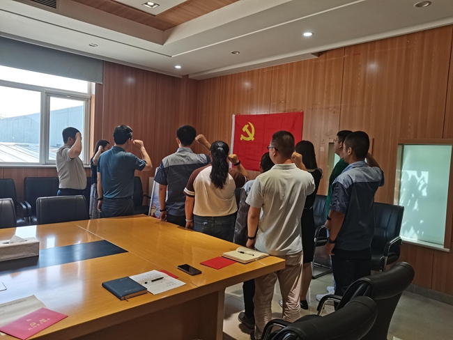 黨支部書記廖贊組織新發(fā)展黨員進(jìn)行入黨宣誓,老黨員重溫入黨誓詞。面對鮮紅的黨旗,廖贊作為領(lǐng)誓人,帶領(lǐng)支部新老黨員一起高舉右手,莊嚴(yán)宣誓。“我志愿加入中國共產(chǎn)黨……”鏗鏘恢宏的誓詞,強(qiáng)烈震撼著在場的每一位黨員,一字一句,神圣而豪邁,體現(xiàn)了對中國共產(chǎn)黨的無限忠誠。