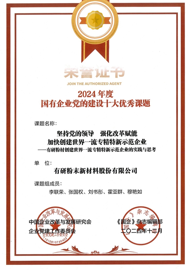 12月6日,在珠海舉辦的(第三屆)國有企業(yè)黨的建設(shè)論壇上,有研粉材黨建成果《堅持黨的領(lǐng)導(dǎo)、強(qiáng)化改革賦能,加快建設(shè)世界一流專精特新示范企業(yè)——有研粉材創(chuàng)建世界一流專精特新示范企業(yè)的實(shí)踐與思考》,被評為“2024年度國有企業(yè)黨的建設(shè)十大優(yōu)秀課題”。