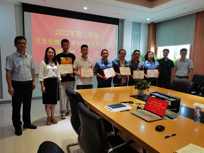 會議還舉行了2022年第二季度黨員先鋒崗、青年安全生產(chǎn)示范崗頒獎儀式。黨支部紀檢委員兼青年委員、副總經(jīng)理李君濤宣讀了獲獎人員名單及其先進事跡材料,領(lǐng)導班子成員為獲獎人員頒發(fā)了榮譽證書。