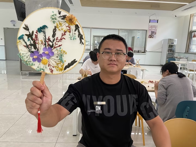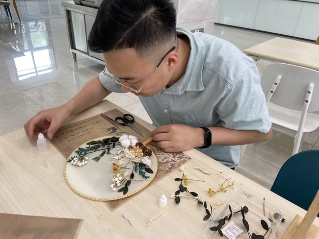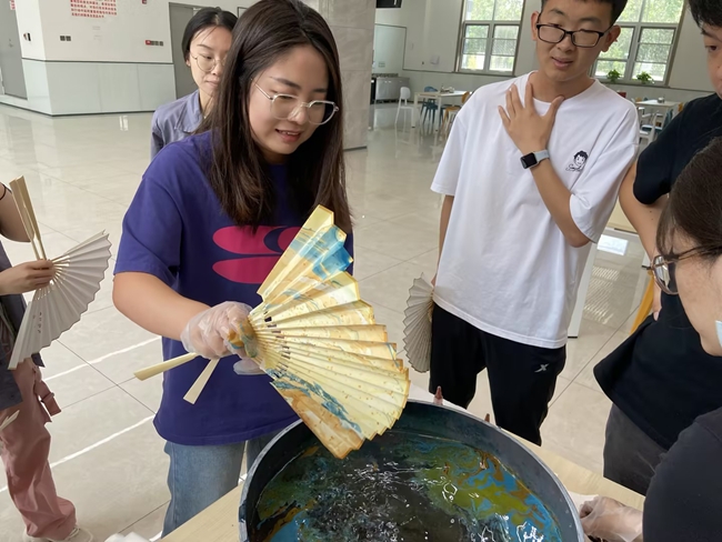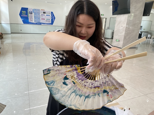 活動(dòng)現(xiàn)場準(zhǔn)備了扇紙、扇骨、團(tuán)扇、花材、油彩等道具。在老師的指導(dǎo)下,青年員工們有的使用折扇,將扇面放入倒?jié)M油彩的水中印出五彩斑斕的色彩;有的選擇團(tuán)扇,將各類花材粘貼到空白團(tuán)扇上,搭配出清新淡雅的畫面?,F(xiàn)場氣氛活躍,其樂融融。