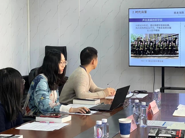 團(tuán)員代表趙寧從時(shí)間線、時(shí)代背景、人物刻畫、收獲與思考四個(gè)方面對《奧本海默傳》一書作了主題分享。她介紹了奧本海默一生對科學(xué)與社會發(fā)展所做出的貢獻(xiàn),并圍繞如何正確利用科學(xué)技術(shù)闡述了個(gè)人見解。她表示,通過閱讀《奧本海默傳》,切身體會到其對物理學(xué)和祖國純粹的熱愛,給我們的工作和生活帶來了指導(dǎo),將以更加堅(jiān)韌的意志和樂觀的心態(tài)迎接未來的挑戰(zhàn)。與會團(tuán)員青年依次從不同角度分享了所思、所悟、所想,在談體會、學(xué)經(jīng)驗(yàn)的濃厚氛圍中受到了鼓舞與啟發(fā),現(xiàn)場掌聲陣陣。