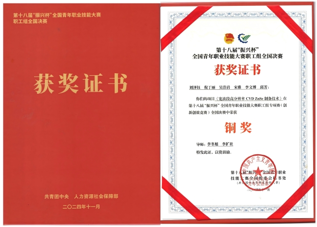 近日,第十八屆“振興杯”全國(guó)青年職業(yè)技能大賽職工組全國(guó)決賽落下帷幕。山東有研國(guó)晶輝團(tuán)隊(duì)?wèi){借參賽項(xiàng)目《寬波段高分辨率CVD ZnSe制備技術(shù)》榮獲大賽職工組專(zhuān)項(xiàng)賽(創(chuàng)新創(chuàng)效競(jìng)賽)全國(guó)決賽銅獎(jiǎng)。