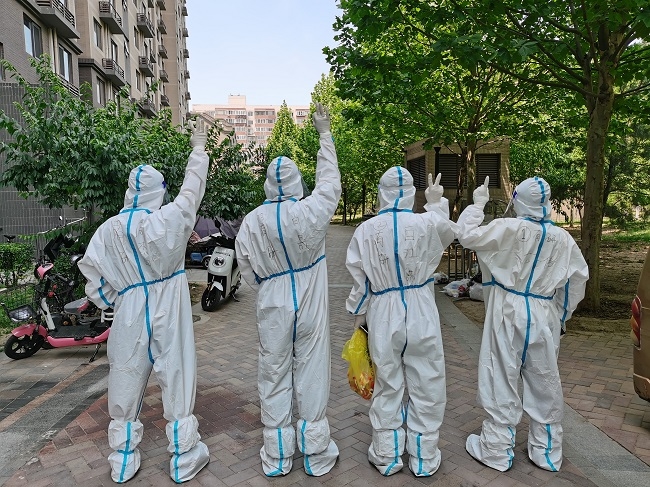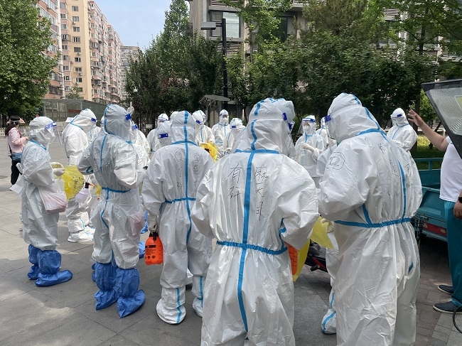 上午8點許,志愿者們集合完畢。按照社區(qū)工作安排,入戶采樣工作陸續(xù)開始。志愿者們配合核酸檢測醫(yī)務(wù)人員,挨家挨戶敲門通知、收還身份證、細(xì)心進(jìn)行身份登記,每棟樓、每個單元、每一樓層、每個人,確保無一遺漏。當(dāng)天北京的最高氣溫到達(dá)32℃,志愿者和醫(yī)務(wù)人員們身著密不透風(fēng)的防護(hù)服,任憑衣物被汗水浸透、面罩被水汽模糊,卻始終堅守在志愿崗位上,盡職盡責(zé)地完成自己的工作使命。許多志愿者們顧不上吃早飯,一直堅持空腹工作到下午3點。
