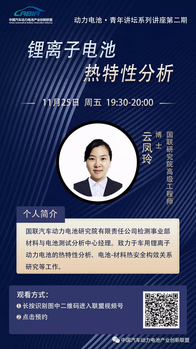國家動力電池創(chuàng)新中心“動力電池·青年講壇”系列講座繼續(xù)開講,11月25日,講座第二期順利上線。本期講座采取視頻號直播形式,邀請國聯(lián)研究院檢測事業(yè)部云鳳玲博士專題分享鋰離子電池熱特性分析研究成果。來自行業(yè)企業(yè)、高校的青年學者近300人參與互動交流,探討鋰離子電池熱特性分析與電池安全設計的關系、熱特性參數(shù)相關檢測方法等技術問題,為鋰離子電池安全性能的改善提供思路,取得了互促共進、共同提升的效果。