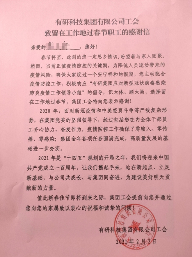 2021年春節(jié)假期,為配合國家疫情防控工作,有研集團廣大職工積極響應(yīng),選擇留在工作地過春節(jié)。為了讓就地過年的職工度過一個有溫度有意義的新春佳節(jié),集團黨委統(tǒng)一部署、精心組織,推出系列暖心舉措。