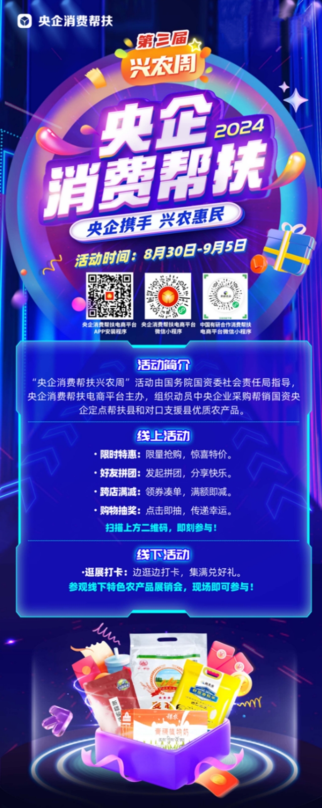 “央企消費(fèi)幫扶興農(nóng)周”由國務(wù)院國資委社會責(zé)任局指導(dǎo),央企消費(fèi)幫扶電商平臺(國網(wǎng)數(shù)字科技控股有限公司)主辦,國務(wù)院國資委機(jī)關(guān)服務(wù)管理局、國務(wù)院國資委新聞中心、國網(wǎng)北京市電力公司、各中央企業(yè)電商平臺聯(lián)合協(xié)辦。