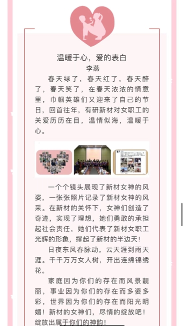 為慶祝“三八”國際婦女節(jié),進一步增強女員工的幸福感、獲得感,體現(xiàn)工會組織的溫暖,有研新材工會于近期在公司內(nèi)部組織開展了“溫暖于心,愛的表白”活動。
