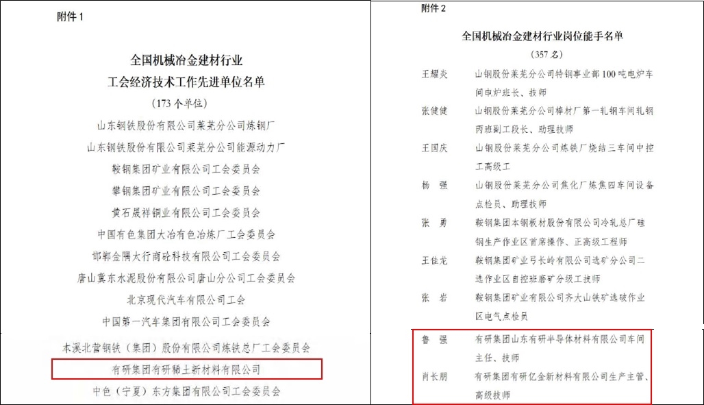 近日,中國機械冶金建材職工技術(shù)協(xié)會表彰了2022年全國機械冶金建材行業(yè)工會經(jīng)濟技術(shù)先進單位和崗位能手。有研集團有1家產(chǎn)業(yè)單位和2名產(chǎn)業(yè)工人獲此榮譽。
