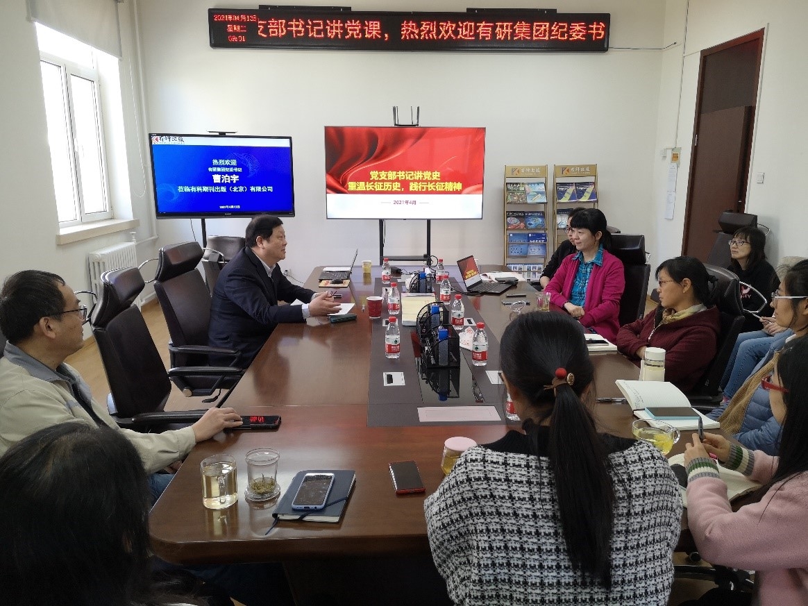 4月13日,有科出版黨支部書(shū)記錢(qián)九紅以“重溫長(zhǎng)征歷史,踐行長(zhǎng)征精神”為題講黨史,并做“堅(jiān)持‘兩個(gè)一以貫之’健全中國(guó)特色現(xiàn)代企業(yè)制度”的主題黨課。有研集團(tuán)黨委委員、紀(jì)委書(shū)記、黨史學(xué)習(xí)教育領(lǐng)導(dǎo)小組副組長(zhǎng)曹泊宇到會(huì)指導(dǎo)。全體黨員、干部職工參加會(huì)議。