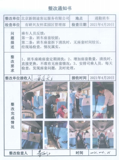 “是換新班車了嗎?怎么這么干凈!”面對煥然一新的班車,乘坐員工發(fā)出了感嘆。4月16日,綜合管理部在收到員工反映問題后第一時間與班車管理單位溝通,經(jīng)過現(xiàn)場檢查后立即聯(lián)絡(luò)協(xié)調(diào),由班車管理單位責(zé)令新朗途客運公司對衛(wèi)生問題進(jìn)行整改,并由司乘人員進(jìn)行定期監(jiān)督檢查。為員工營造一個舒適、良好的通勤環(huán)境。