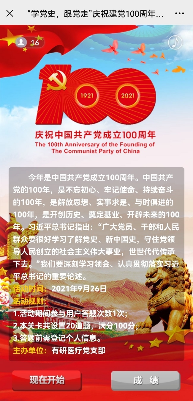 為更好地學(xué)習(xí)黨史、了解黨史,檢驗(yàn)學(xué)習(xí)效果,有研醫(yī)療黨支部于9月26日組織全體黨員、入黨積極分子開展了“學(xué)黨史,跟黨走”慶祝建黨100周年黨史知識競賽。競賽包括單選題和多選題,題目隨機(jī)生成,共20道題目,每人1次答題機(jī)會,答題限時10分鐘。經(jīng)過激烈角逐,最終評選出一等獎1名,二等獎2名,三等獎3名,優(yōu)秀獎和參與獎若干名。