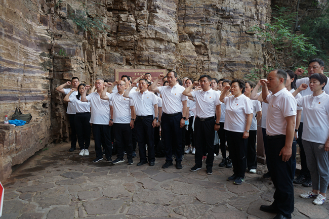 接下來(lái),黨員們沿著紅旗渠建設(shè)者的足跡,重走“水長(zhǎng)城”,參觀了紅旗渠的分水樞紐——分水閘,徒步登上紅旗渠咽喉工程——青年洞。在青年洞前,大家面向鮮紅的黨旗重溫入黨誓詞,莊嚴(yán)宣誓,鏗鏘有力的誓言在青翠的山谷間久久回蕩。
