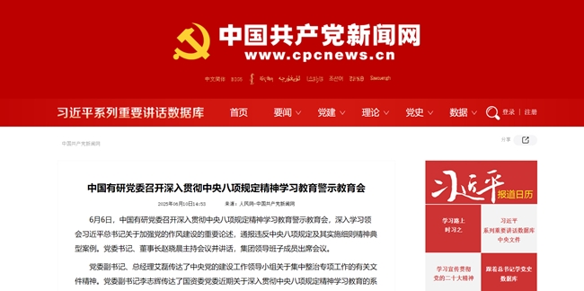 6月10日中國(guó)共產(chǎn)黨新聞網(wǎng)刊發(fā)中國(guó)有研召開(kāi)警示教育會(huì)情況