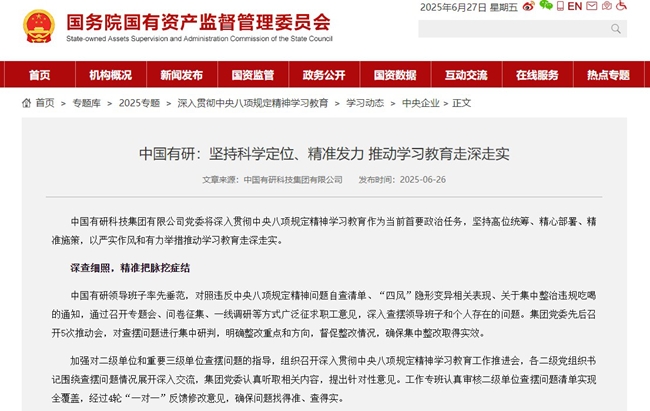 6月26日國(guó)務(wù)院國(guó)資委官網(wǎng)報(bào)道中國(guó)有研對(duì)標(biāo)查擺和深入整改特色做法
