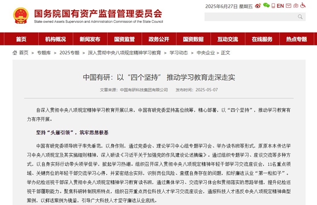 5月7日國(guó)務(wù)院國(guó)資委官網(wǎng)報(bào)道中國(guó)有研一體推進(jìn)學(xué)查改特色做法