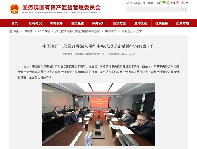 4月2日國(guó)務(wù)院國(guó)資委官網(wǎng)報(bào)道中國(guó)有研部署開(kāi)展工作情況