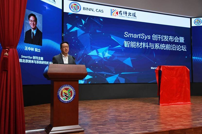 3月26日,由北京市科學(xué)技術(shù)委員會(huì)主管,中國(guó)科學(xué)院北京納米能源與系統(tǒng)研究所(簡(jiǎn)稱(chēng)納米能源所)主辦,有科出版編輯出版的高起點(diǎn)新刊SmartSys(《智能系統(tǒng)(英文)》)創(chuàng)刊發(fā)布會(huì)暨智能材料與系統(tǒng)前沿論壇,在坐落于懷柔科學(xué)城的納米能源所召開(kāi)。中國(guó)科學(xué)技術(shù)協(xié)會(huì)科學(xué)技術(shù)創(chuàng)新部部長(zhǎng)劉興平,中國(guó)科學(xué)院外籍院士、納米能源所所長(zhǎng)、SmartSys主編王中林,國(guó)家自然科學(xué)基金委員會(huì)科學(xué)傳播與成果轉(zhuǎn)化中心主任彭杰,中國(guó)期刊協(xié)會(huì)副會(huì)長(zhǎng)、有科出版總編輯錢(qián)九紅,中國(guó)科學(xué)院文獻(xiàn)情報(bào)中心計(jì)量與評(píng)價(jià)部研究員馬崢,約翰威立國(guó)際出版集團(tuán)中國(guó)區(qū)合作出版總監(jiān)張大平,懷柔區(qū)科學(xué)技術(shù)委員會(huì)創(chuàng)新發(fā)展科馬順昌,北京大學(xué)材料與工程學(xué)院副院長(zhǎng)周歡萍等人出席。
